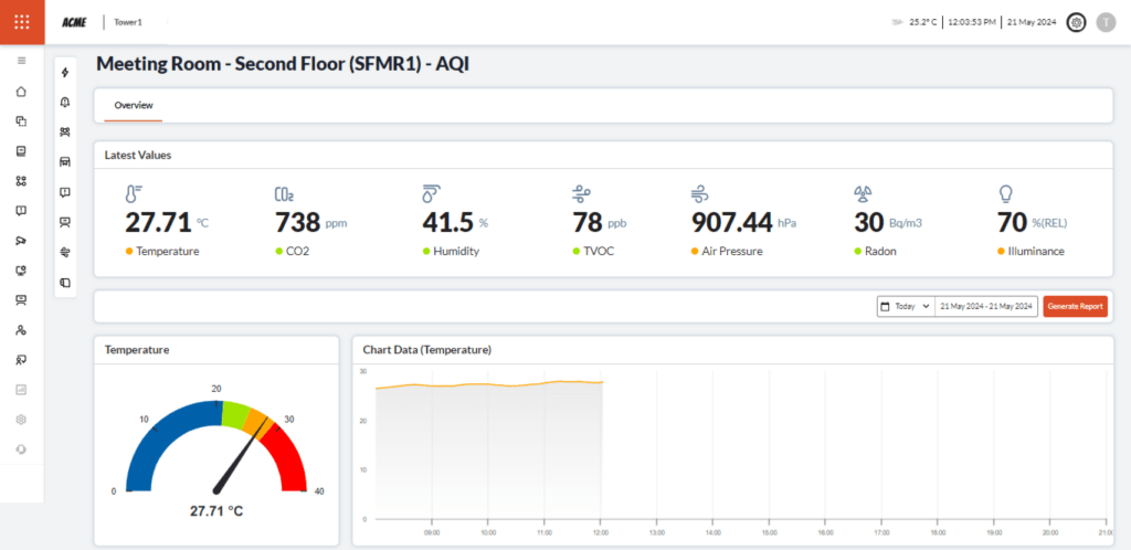 The detailed view page has ‘Overview’ and ‘Floor View’ tabs. The ‘Overview’ tab displays the information of the different areas of a particular floor. Select a particular floor from the dropdown for specific floor information. To see more details of a certain floor, click the detailed view icon (located on the right side top corner). Also, you can download the report of that particular floor.