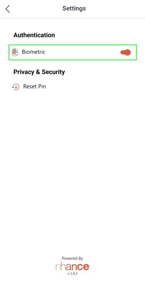 If you say ‘Yes’ It will take you to the settings screen to enable the Biometrics slider. See the screenshot below.