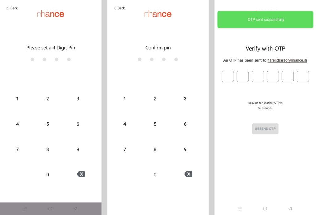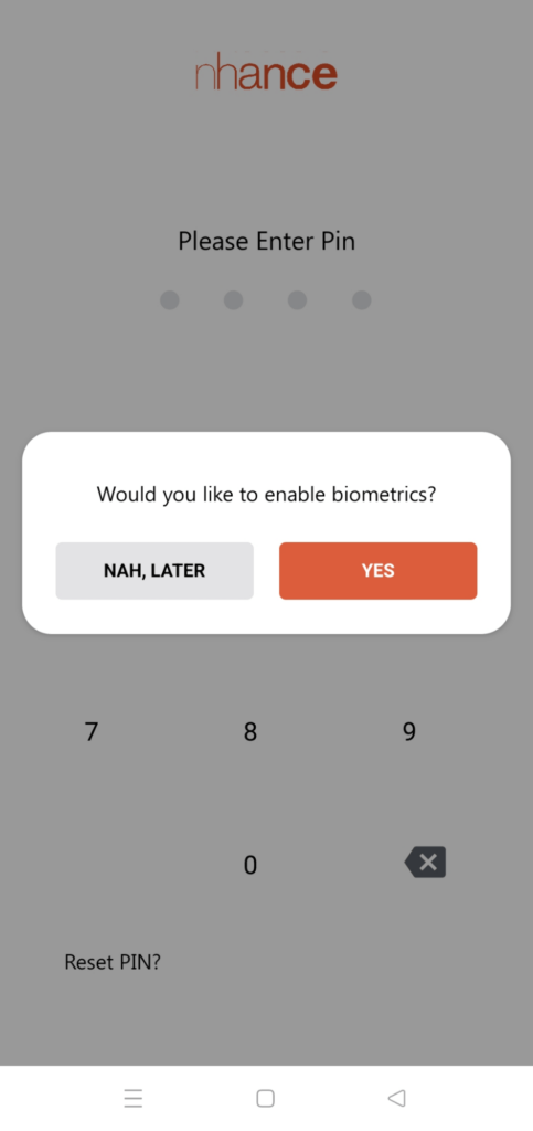 Once you enter your password you will be asked to enable biometric authentication. If you click on ‘Yes’ then a popup will appear and you have to give your fingerprint and then it will take you to the home screen of the app. If you click on ‘Nah, later’ you will be presented with the ‘Please Enter Pin’ screen. Enter the pin and then it will take you to the home screen.