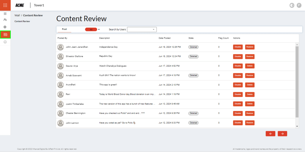 Posts can be accessed by clicking the ‘Wall’ button in the menu (marked in green) on the dashboard. You will then land on the ‘Content Review’ page, as shown in the image below.