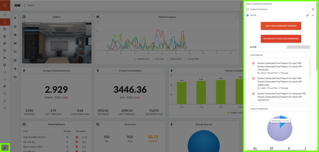 The dashboard allows you to customize the dashboard and manage templates from a customization menu. This menu also allows adding or removing widgets from the dashboard and saving them as templates.