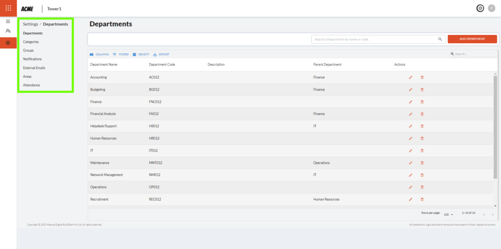 1.1 A department can be added by clicking the ‘Add Department’ button, situated to the right of the search bar.