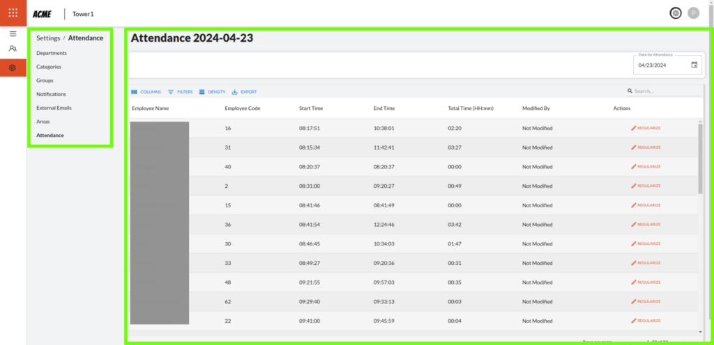 7. Attendance – This screen allows viewing and monitoring the attendance of employees by recording their in and out times. It allows regularizing attendance by raising a request and rectifying incorrect attendance entries.