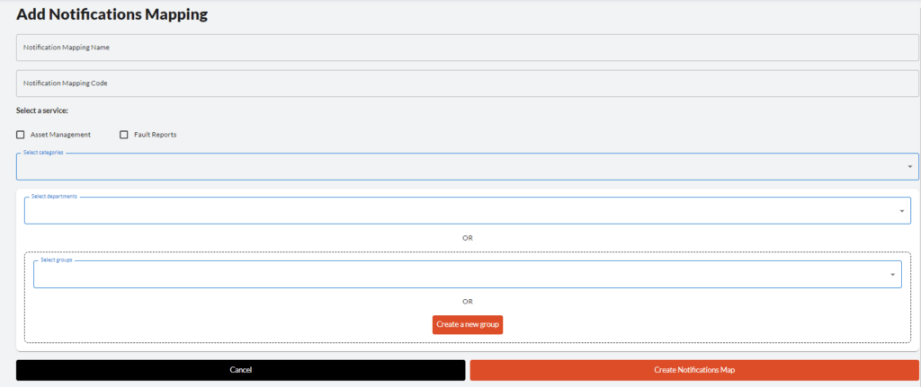4. Notifications – This section allows you to set up notifications for services such as Asset Management and Fault reporting, for specific groups or departments.