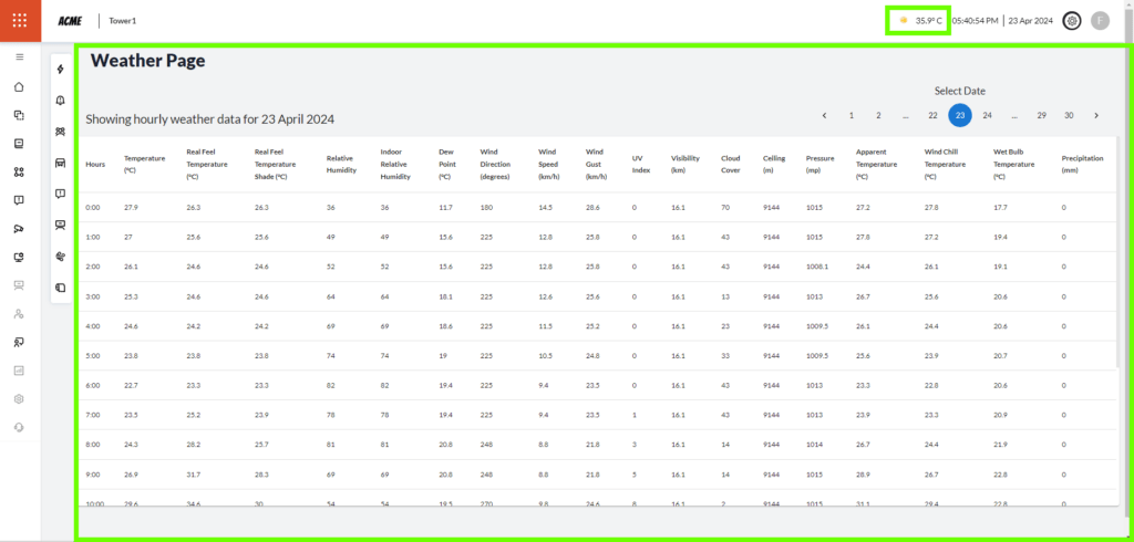 The weather page shows hourly weather data, for 24 hours, for the whole month.