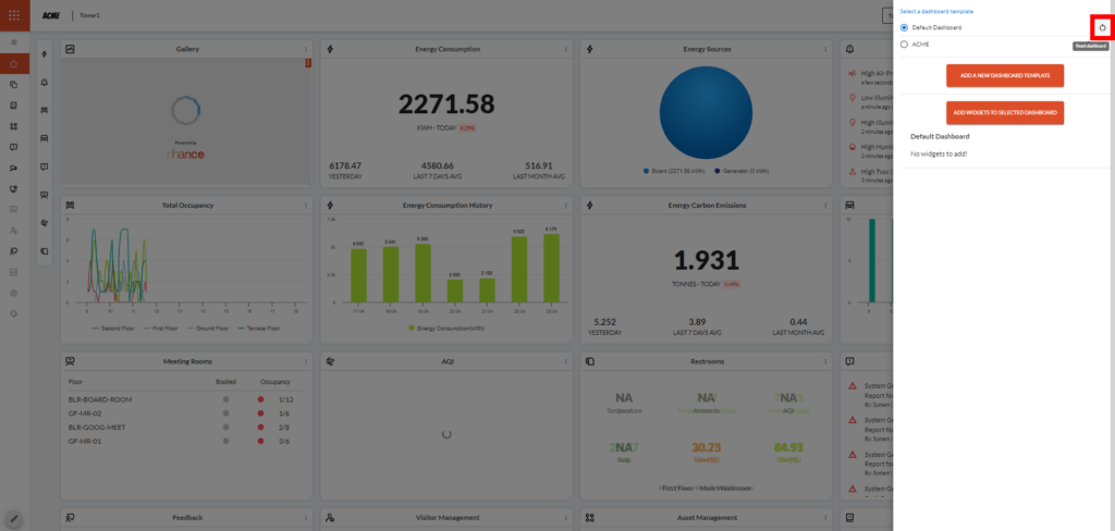 The dashboard consists of multiple widgets, a.k.a. cards, displaying information on the various components of the twin that can be customized along with dashboard templates.