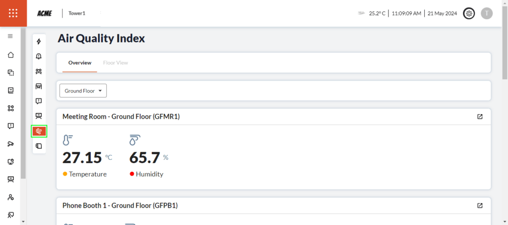 The detailed view page has ‘Overview’ and ‘Floor View’ tabs. The ‘Overview’ tab displays the information of the different areas of a particular floor. Select a particular floor from the dropdown for specific floor information. To see more details of a certain floor, click the detailed view icon (located on the right side top corner). Also, you can download the report of that particular floor.
