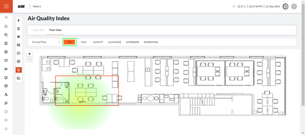 The ‘Floor View’ tab displays the values on a floorplan. Value (marked in green), The Concentration of a particular value on a particular area on the floorplan (marked in red) is shown below.