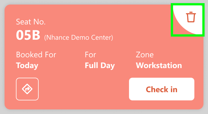 Click on the ‘Book a Desk’ icon on the home screen, then you will see the booking information in the form of a ticket below ‘Next booking’. Click on the ‘Trash’ icon to delete the booking.