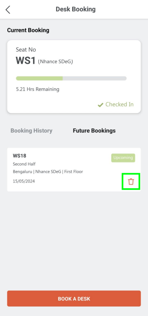 Click on the ‘Book a Desk’ icon on the home screen, then you will see the booking information in the ‘Future bookings’ tab. Click on the ‘Trash’ icon to delete the booking.