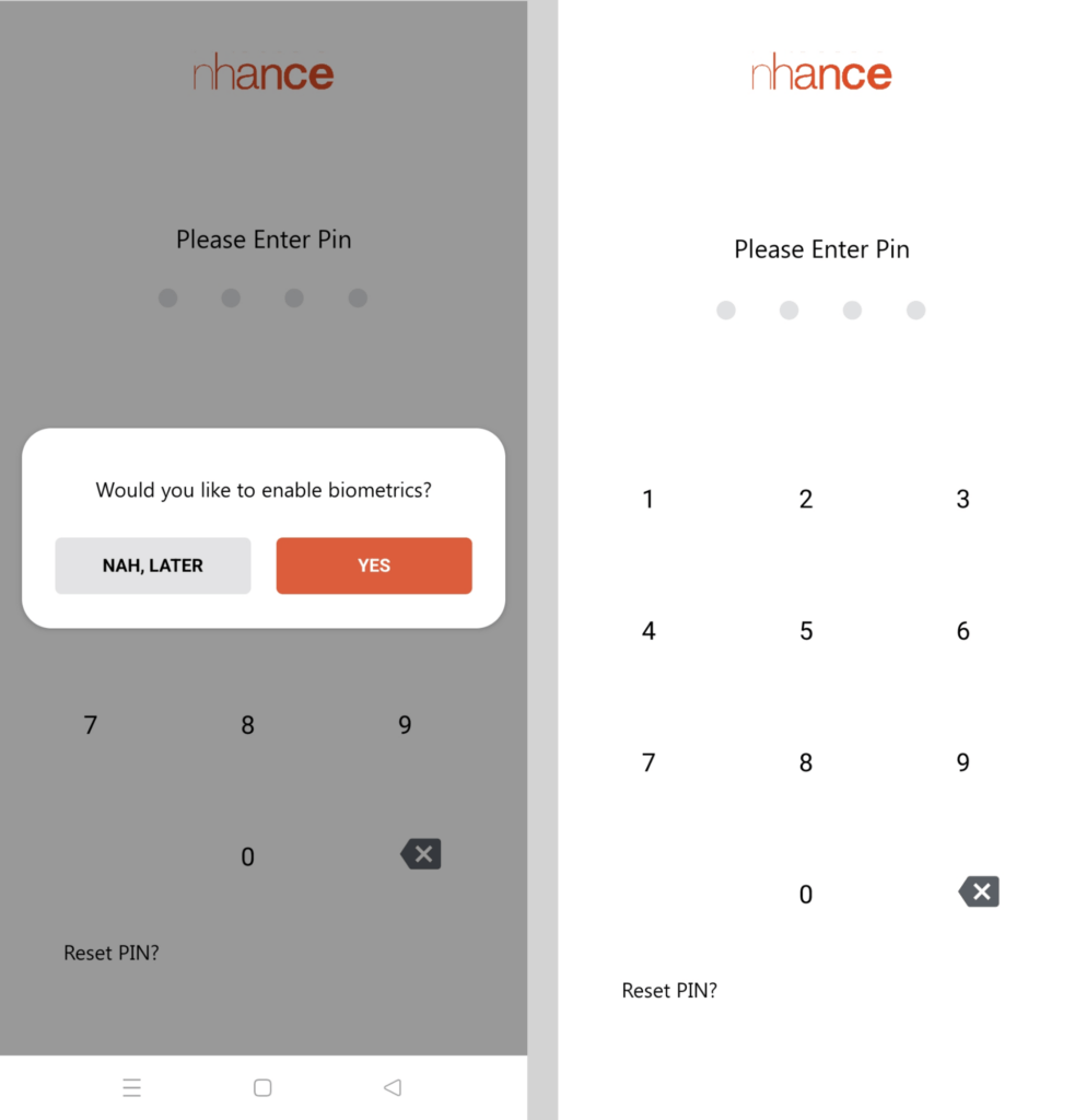 Once you enter your password you will be asked to enable biometric authentication. If you click on ‘Yes’ then a popup will appear and you have to give your fingerprint and then it will take you to the home screen of the app. If you click on ‘Nah, later’ you will be presented with the ‘Please Enter Pin’ screen. Enter the pin and then it will take you to the home screen.