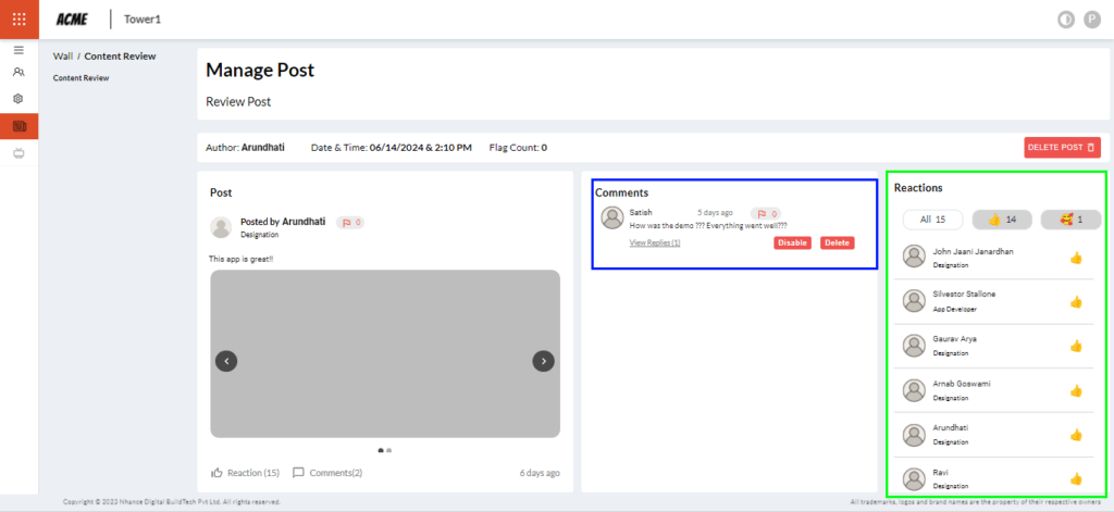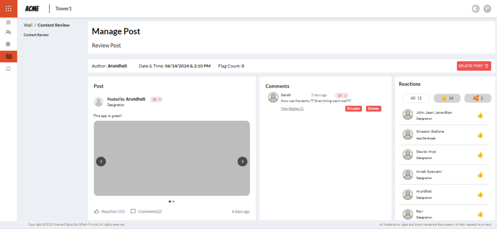 2. Post: Displays the name of the person, designation, what they have posted, images, reactions and comments
