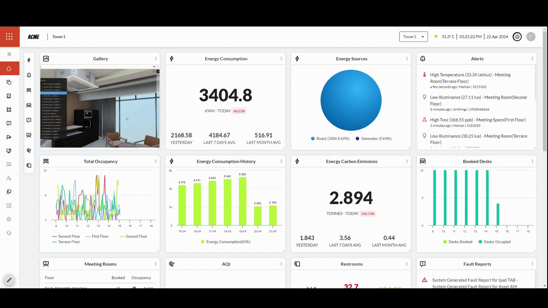 The dashboard consists of multiple widgets, a.k.a. cards, displaying information on the various components of the twin.