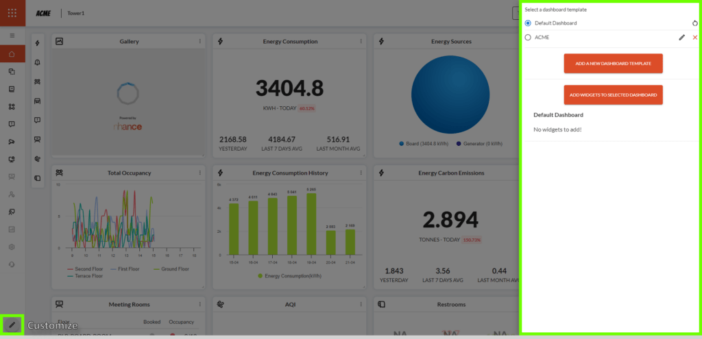 The dashboard allows you to customize the dashboard and manage templates from a customization menu. This menu also allows adding or removing widgets from the dashboard and saving them as templates.