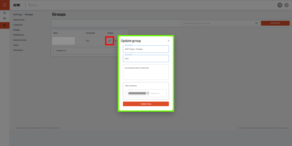 3.4 An existing group can be edited by clicking the pencil icon in the ‘Action’ column (marked in red). Editing a group presents us with a menu similar to Adding a group.