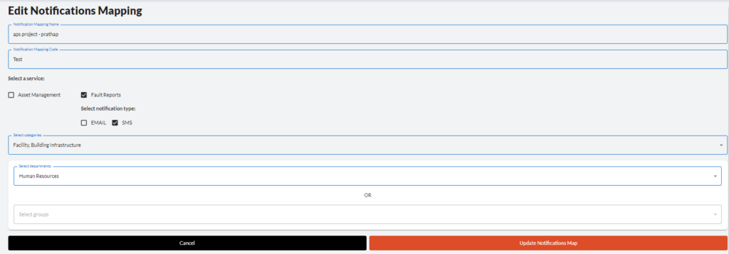 3. Groups – Various members of the company can be added to groups to add Notification Mappings, for services such as Asset Management and Fault Reporting. Members in these groups receive notifications for the subscribed services via either email or SMS.
