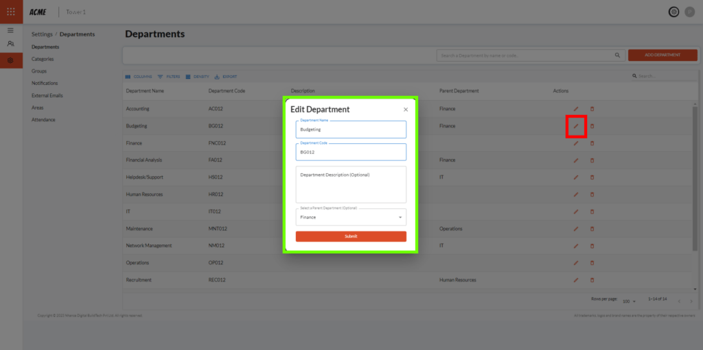 1.3 An existing department can be edited by clicking the pencil icon in the ‘Action’ column (marked in red). Editing a department presents us with a menu similar to Adding a department.