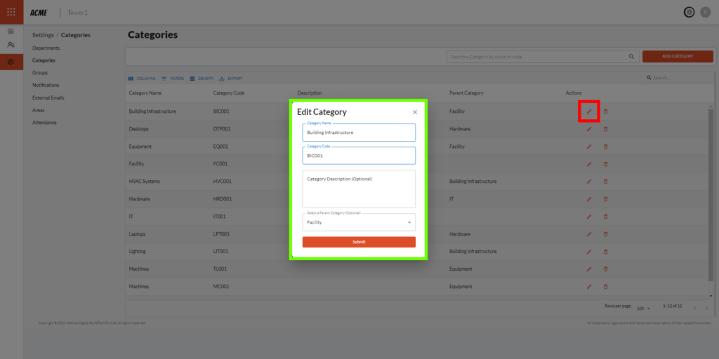 2. Categories – Similar to departments, Categories are used to assign Assets and faults for organizational purposes.