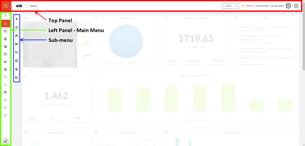 1.1 The Top Panel displays information about the company and the property currently being looked at along with its brand logo to the left, beside the Navigation button.