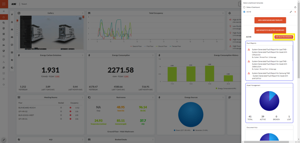 Widgets can be added back to the templates by selecting ‘Add Widgets to Selected Dashboard’ choosing the widgets to be added and selecting the ‘Add Selected Widget(s)’ button (marked in yellow).
